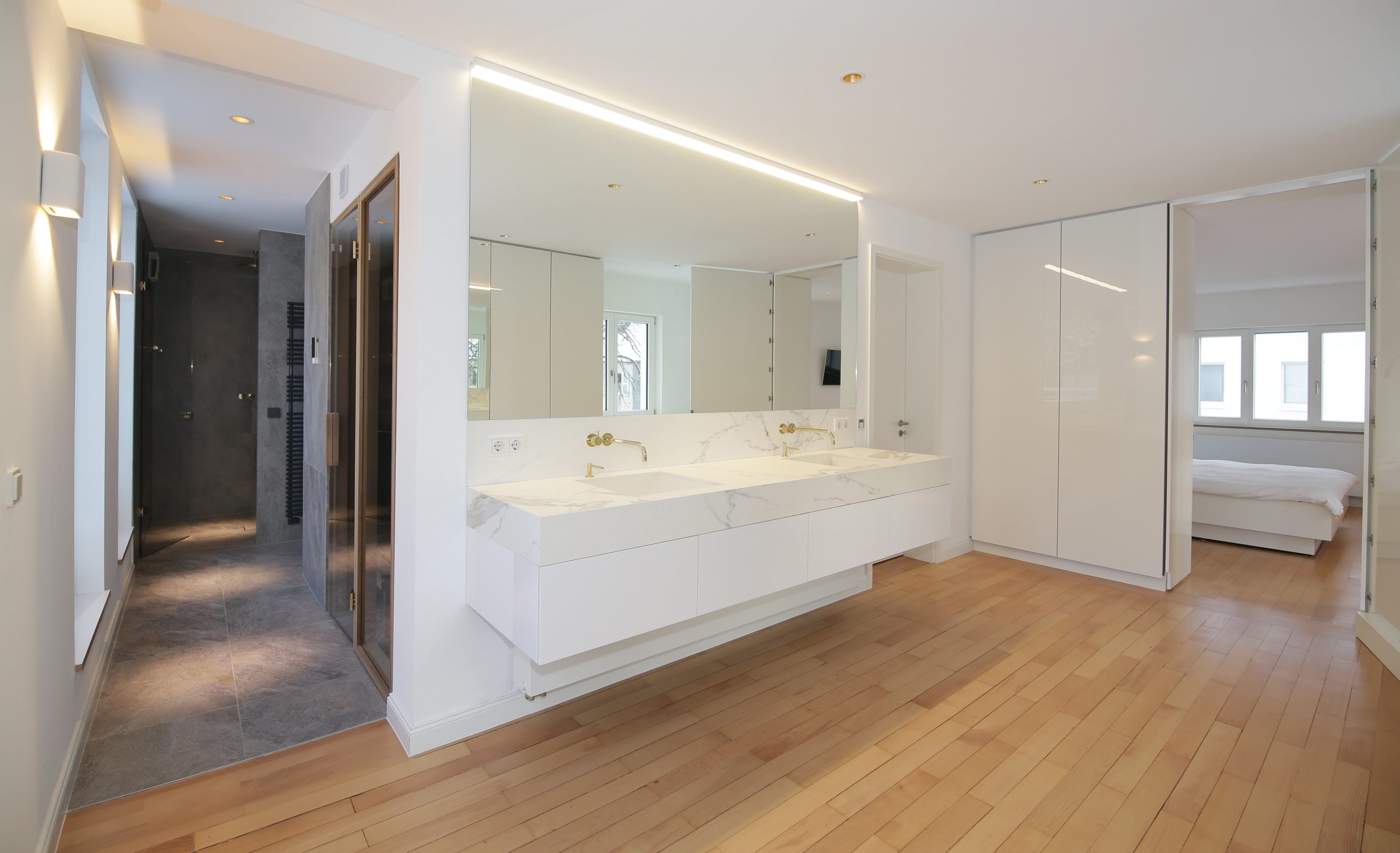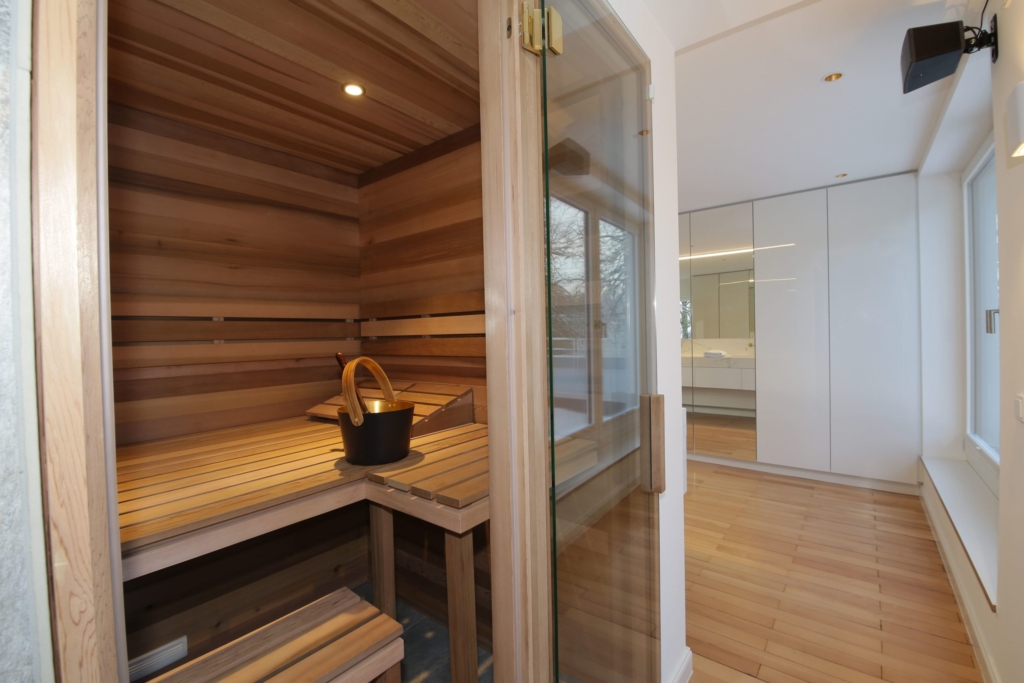 Sämtliche Einbaumöbel, Küche und Ankleide, sowie die Bäder, das Einrichtungskonzept und die Beleuchtung wurden durch das planende Büro entworfen. Die Sauna aus Nussbaumholz wurde nach dem Entwurf des Büros individuell gefertigt. Der neue, glatte Außenputz und Anstrich wurden mit mineralischen Materialien ausgeführt. Die vorhandenen Sandsteinsockel und Gewände wurden gereinigt und renoviert.