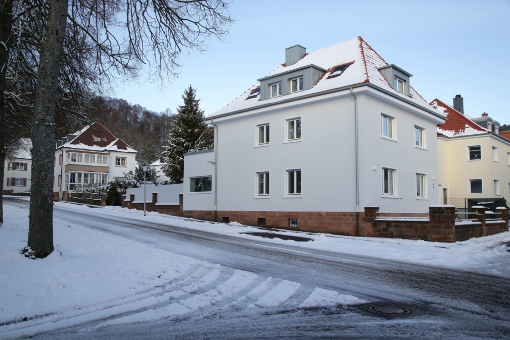 Die Stadtvilla, Baujahr 1900 wurde entkernt und grundsaniert. Die rückseitige Erweiterung aus den 50er Jahren wurde in den Wohnbereich integriert. Der Anbau eines neuen Eingangsbereiches mit Abstellraum und die Erweiterung der Garage ergänzen das Raumprogramm.